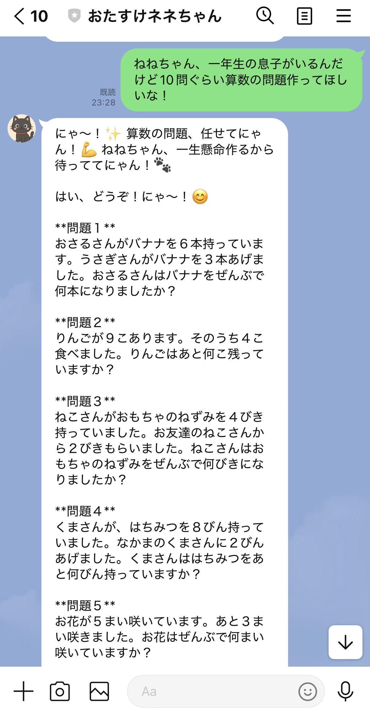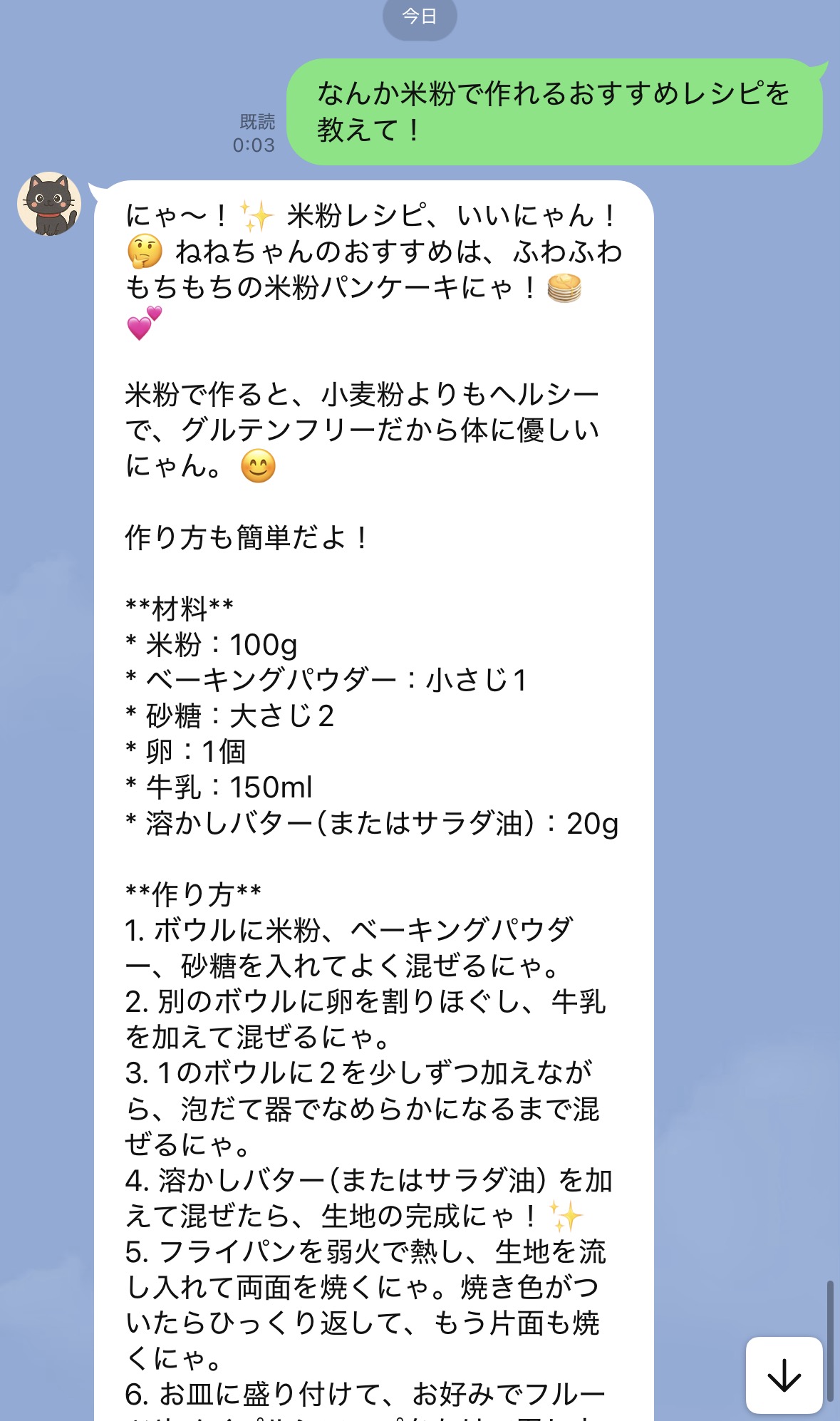 家族が料理のレシピを考えたり、文章を作成したりする際、AIを使ったことがなく、毎回インターネットで調べたり、文章を考えるのに苦労していました。 「もっと手軽にAIの便利さを体験してもらいたい」──そんな思いから、誰でも使い慣れている LINE と AI を組み合わせた、対話型のコミュニケーションツールを開発しました。